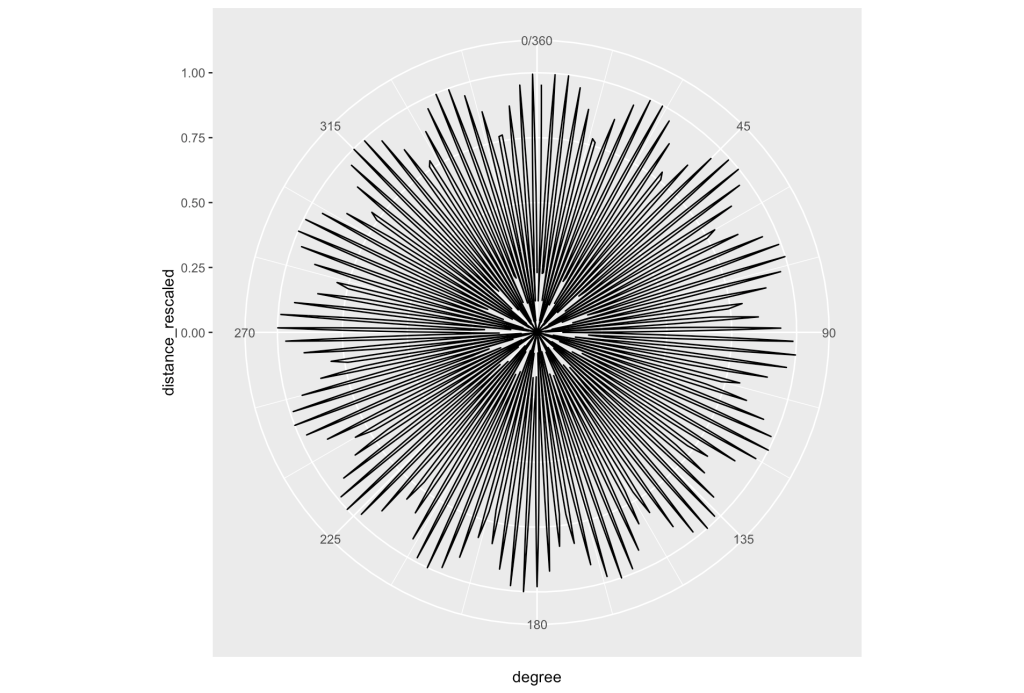 Let’s take a break. I want to try out the approach that came out of the Microsoft Camp when visual analysis was done back in part 2. Bing’s AI Chat7 decided that it saw a pattern that looked like the rose plot where the formula given is r = sine(2*theta)). That is not difficult to generate using some code. Let’s look at the polar plot: