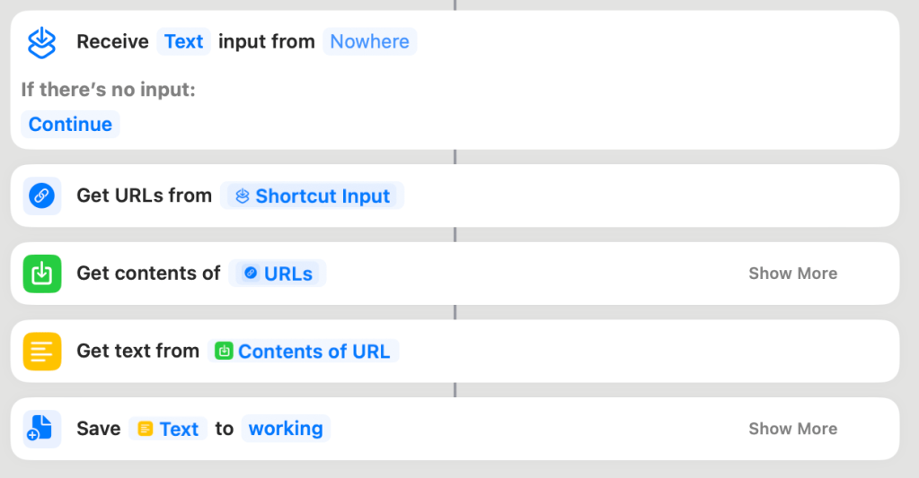 I did some research looking for such a tool. Fortunately, we have one available and it’s even on the iPad. A low-code tool is available from Apple. It is called Shortcuts and focuses on automation. There are several components that suggest it can read a web site and pull the information into a text file. That sounds great!