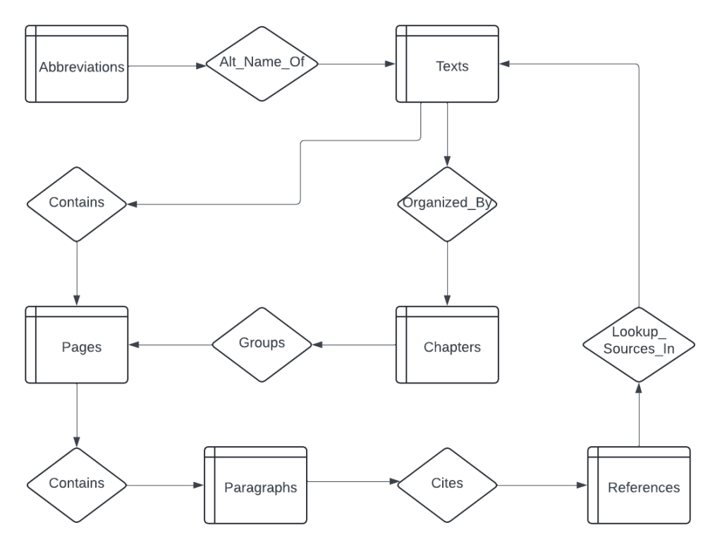 | Chapters | These are optional (ex: simple letter on a teaching). When entry exists, must have a relationship to at least one page and one text. |